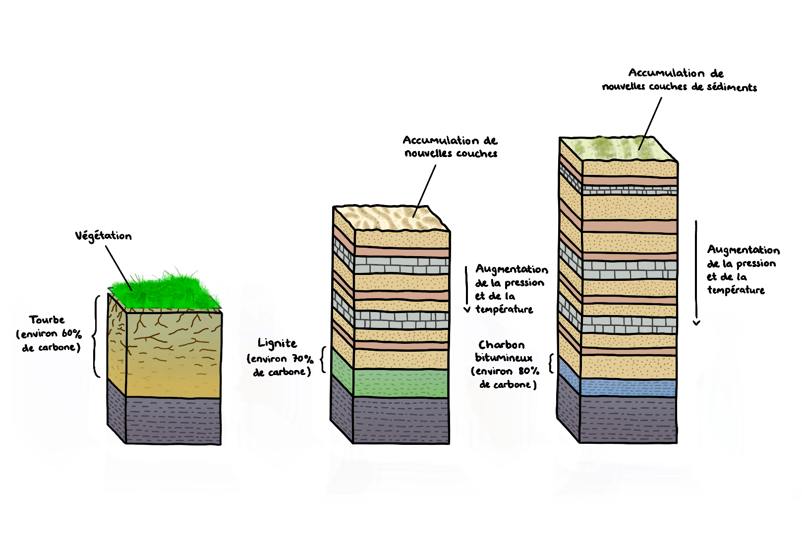 Les terres s'affaissent, les débris végétaux s'accumulent, fermentent et sont enfouis sous les sédiments.